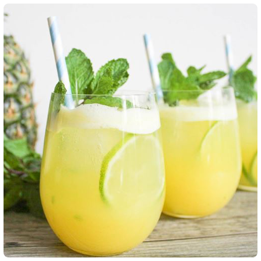Put the pineapple, then the orange and finally the mint into the juice extractor. Ideal for treating digestive problems and for boosting you up thanks to vitamin C.