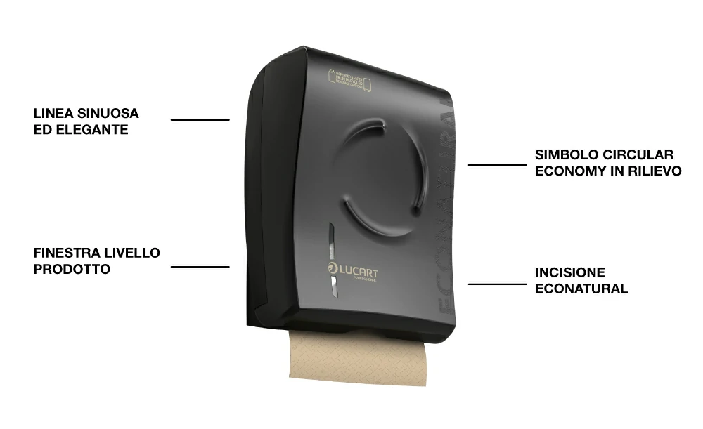 Lucart Professional gives new life to all components of beverage cartons: from the cellulose fibers it creates Fiberpack®, which is used to produce paper, and from the aluminum and polyethylene it produces Al.Pe.®, the certified recycled raw material that becomes the dispensers, now available in a new unique, patented design.