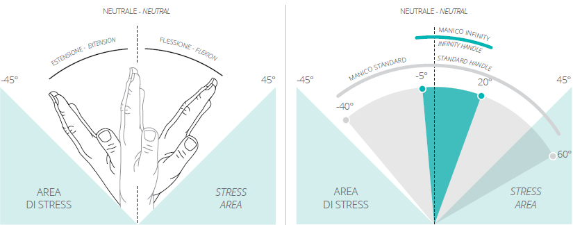 The Infinity handle allows the wrist to remain in a neutral position, significantly reducing effort, unlike standard handles that subject it to strong flexion-extensions that can cause the onset of musculoskeletal disorders over time.